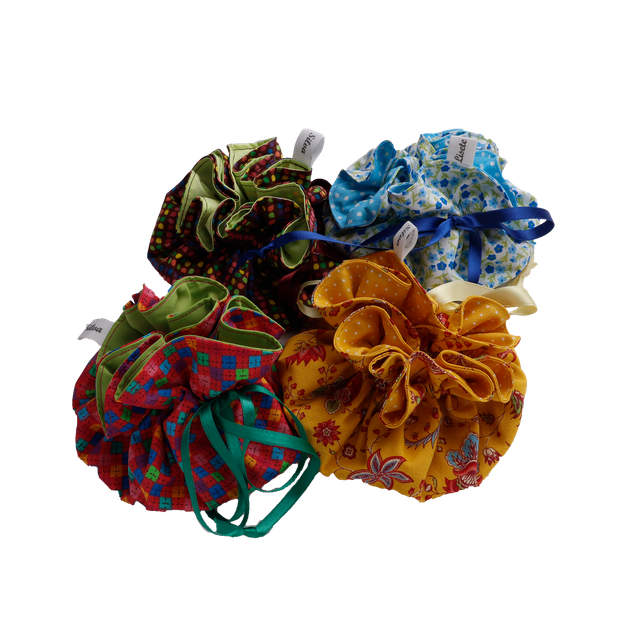 Feito com tecidos de algodão em padrões variados, o interior é dividido em compartimentos que ajudam a separar cada tipo de peça, evitando embaraços ou riscos. O fecho em fita permite ajustar a abertura e manter tudo seguro.